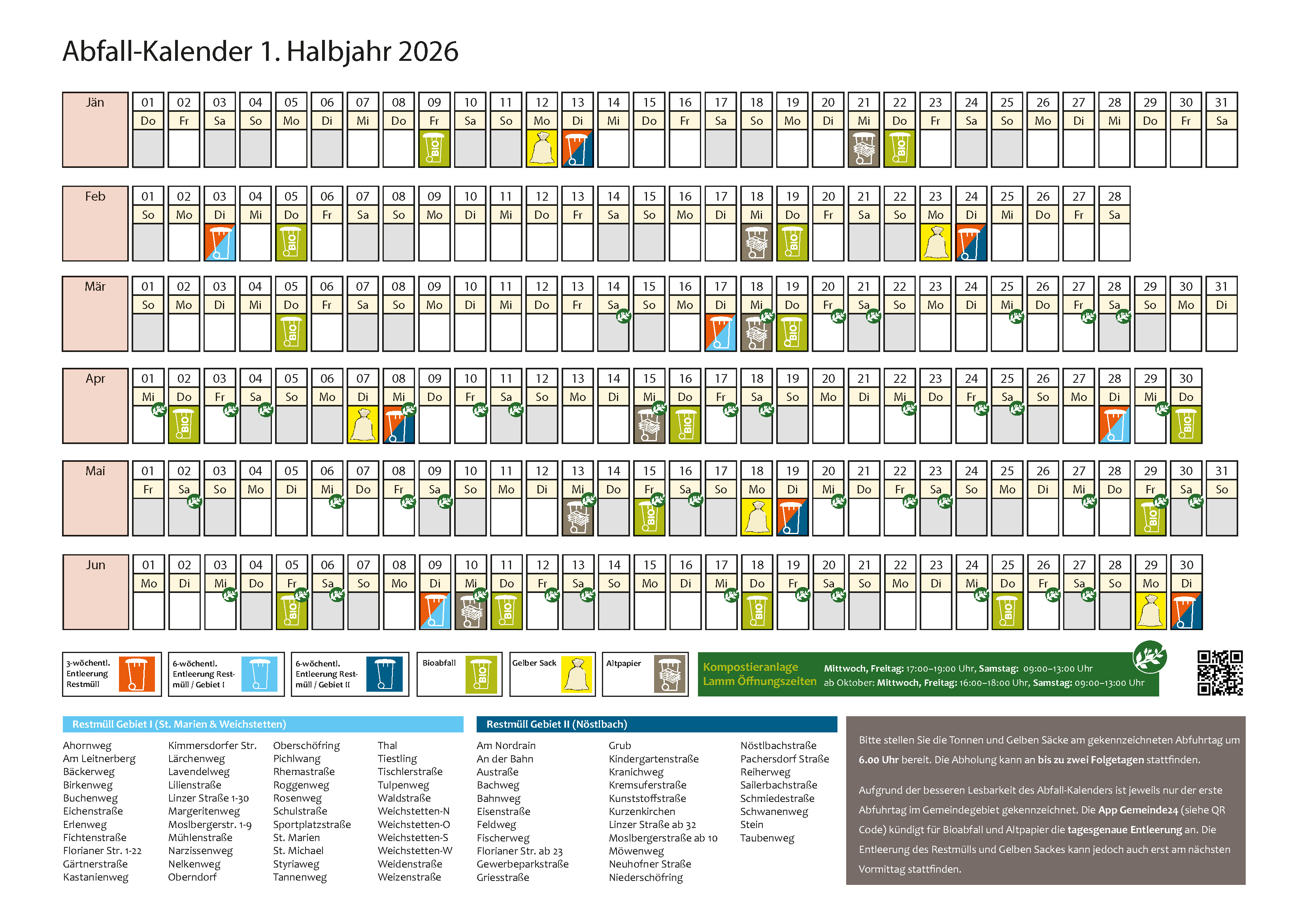 Altstoffsammelzentrum KremstalMontag von 08.00 bis 12.00 Uhr und 13.00 bis 18.00 Uhr Kompostieranlage Lammab 14. März 2026: ab Oktober bis einschließlich 21. November 2026: |